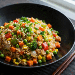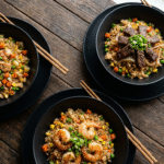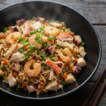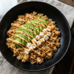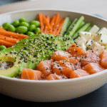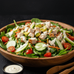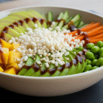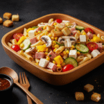 Base de pasta codo o fusilli, 2 proteínas y 5 vegetales.